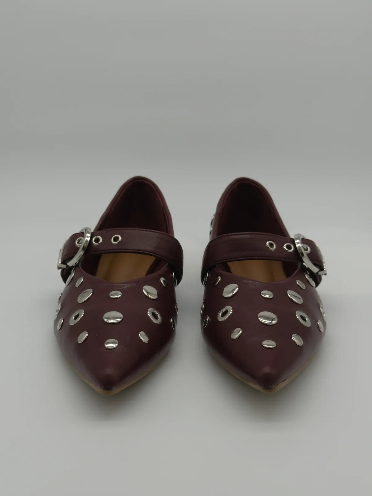 Estes sapatos rasos femininos com fivela e tachas unem elegância e ousadia num só modelo. Com biqueira fina e aplicações metálicas, estes sapatos foram pensados para mulheres que gostam de expressar o seu estilo com personalidade e confiança.