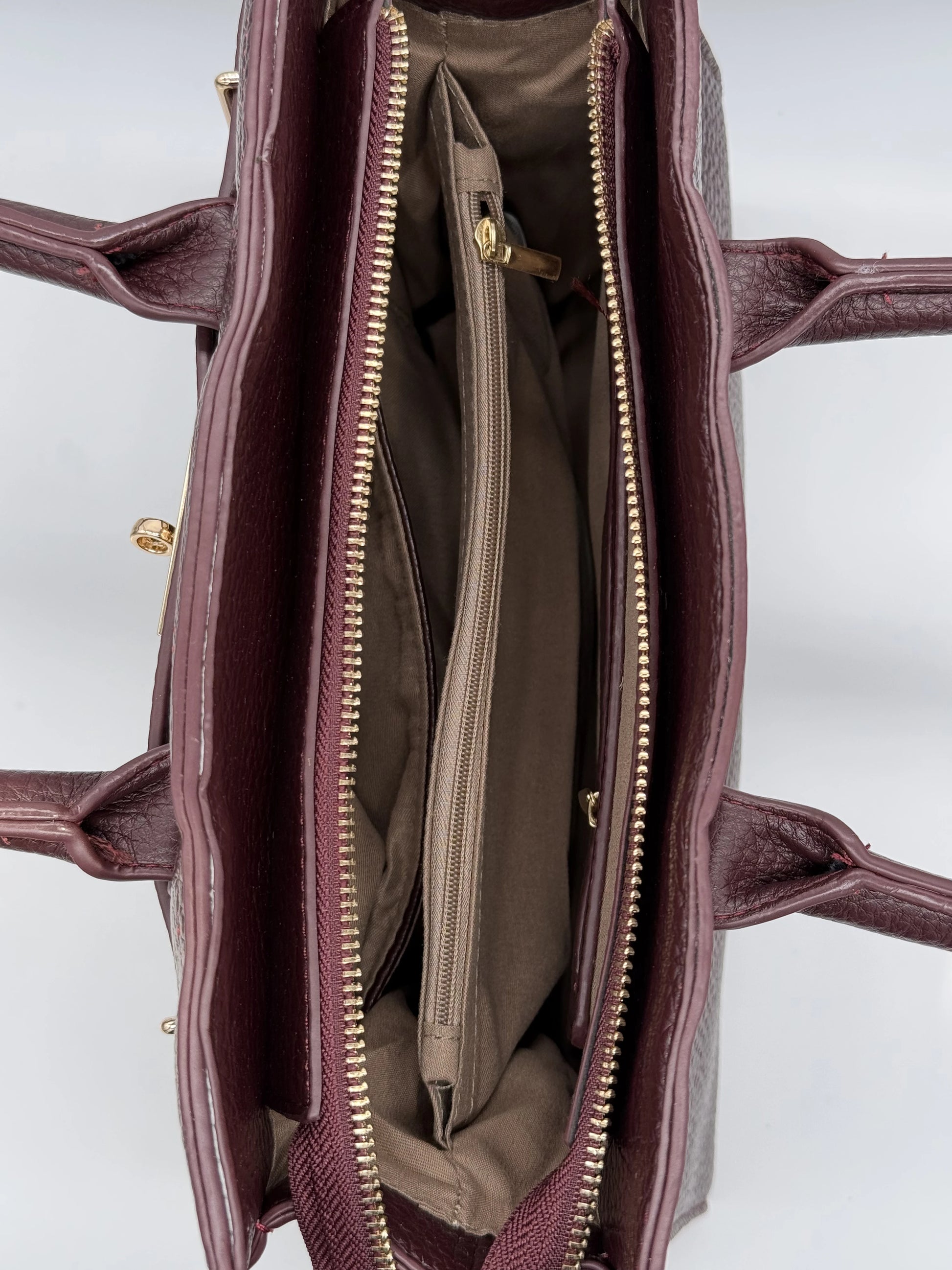 O interior destaca-se pelo compartimento central e o fecho, ideal para separar e proteger os teus essenciais, como carteira, telemóvel ou documentos. As zonas laterais oferecem espaço adicional, permitindo uma organização prática e intuitiva ao longo do dia.